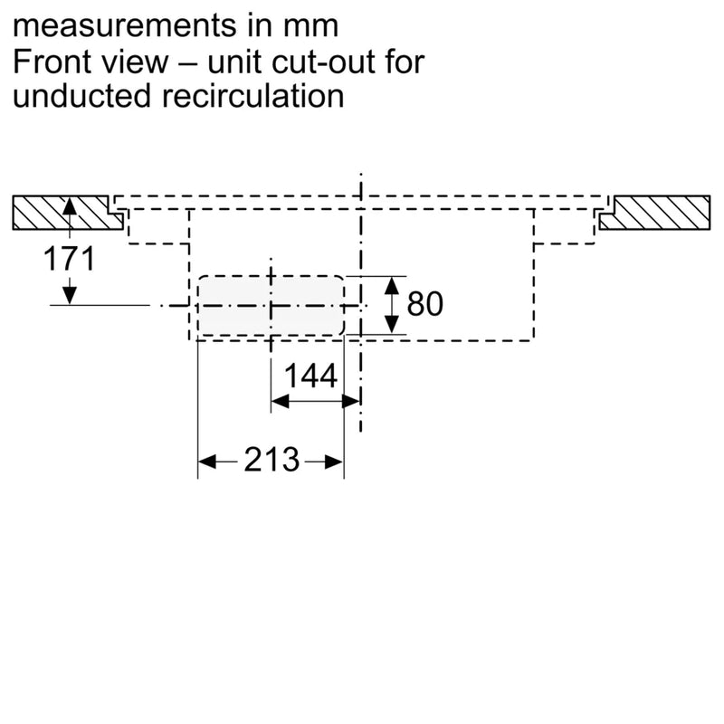 • Suitable for ducted or recirculated extraction configuration (incl. differentiated software modes). Installation accessories for unducted recirculation, among these four cleanAir Plus odour filters and a telescopic slider element, are included in the cooktop accessories. For other installation options are available, details in the planning notes.
