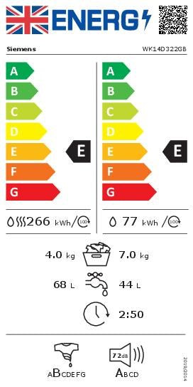 Performance Energy Efficiency Class Wash and Dry¹: E Energy Efficiency Class Washing²: E Energy³ / Water⁴ Wash and Dry: 266 kWh / 68 litres Energy⁵ / Water⁶ Washing: 77 kWh...
