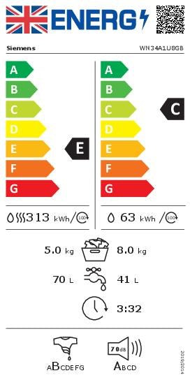 Performance Energy Efficiency Class Wash and Dry¹: E Energy Efficiency Class Washing²: C Energy³ / Water⁴ Wash and Dry: 313 kWh / 70 litres Energy⁵ / Water⁶ Washing: 63 kWh...