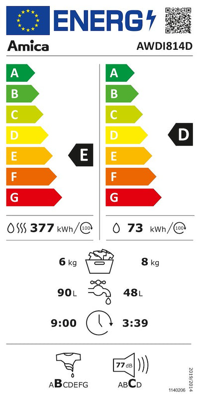 White Amica Free-standing 1400rpm Washer Dryer AWDI814D, this E/D energy rated model comes with 8 kg drum capacity. This Amica washer dryer has install dimensions of 59.7cm (width) x 84.5cm (height) x 58.2cm (depth) and a washing noise level of 58dB, drying noise level of 64dB & spinning noise level of 77dB. The AWDI814D model also comes with 11 number of wash programmes and 4 number of drying programmes, Dial Display controls, adjustable drying temperatures, spin speed options, delay timer, wide opening door, control panel lock, daily quick programme, economy wash, quick wash, silk wash, extra spin, wool programme, delicate wash, allergy care, intensive cycle, cotton programme, synthetics, and a manufacturer's warranty of 2 years for peace of mind.