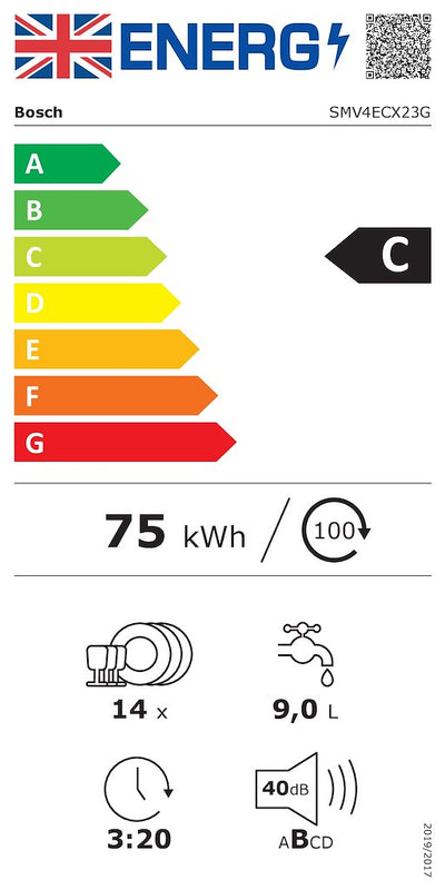 Performance Energy Efficiency Class¹: C Energy² / Water³: 75 kWh / 9 litres Capacity: 14 place settings Programme duration⁴: 3:20 (h:min) Noise level: 40 dB(A) re 1 pW Noise Efficiency...
