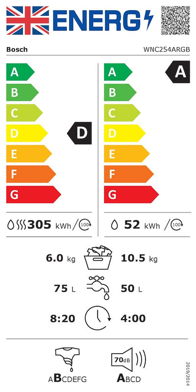 Performance Energy Efficiency Class Wash and Dry¹: D Energy Efficiency Class Washing²: A Energy³ / Water⁴ Wash and Dry: 305 kWh / 75 litres Energy⁵ / Water⁶ Washing: 52 kWh...